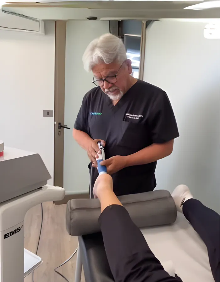 Primera sesión de terapia suiza: Aplicamos la tecnología Swiss DolorClast® (EMS), que estimula la regeneración natural del tejido, reduce la inflamación y alivia el dolor desde la primera sesión.