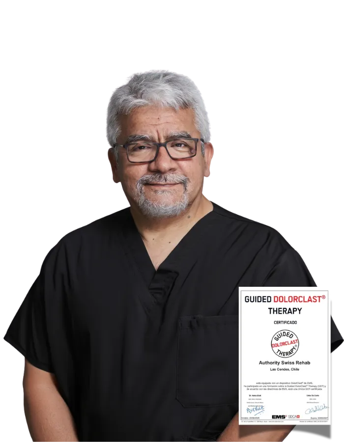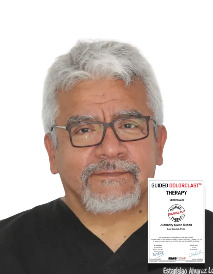 Estanislao Álvarez, kinesiólogo con más de 40 años de trayectoria en rehabilitación musculoesquelética y 7 años de experiencia aplicando la tecnología suiza Swiss DolorClast® (EMS), es el único profesional en Chile certificado en Guided DolorClast® Therapy (GDT). Su formación en Europa y su enfoque basado en evidencia lo posicionan como referente en el uso clínico de esta tecnología en Chile